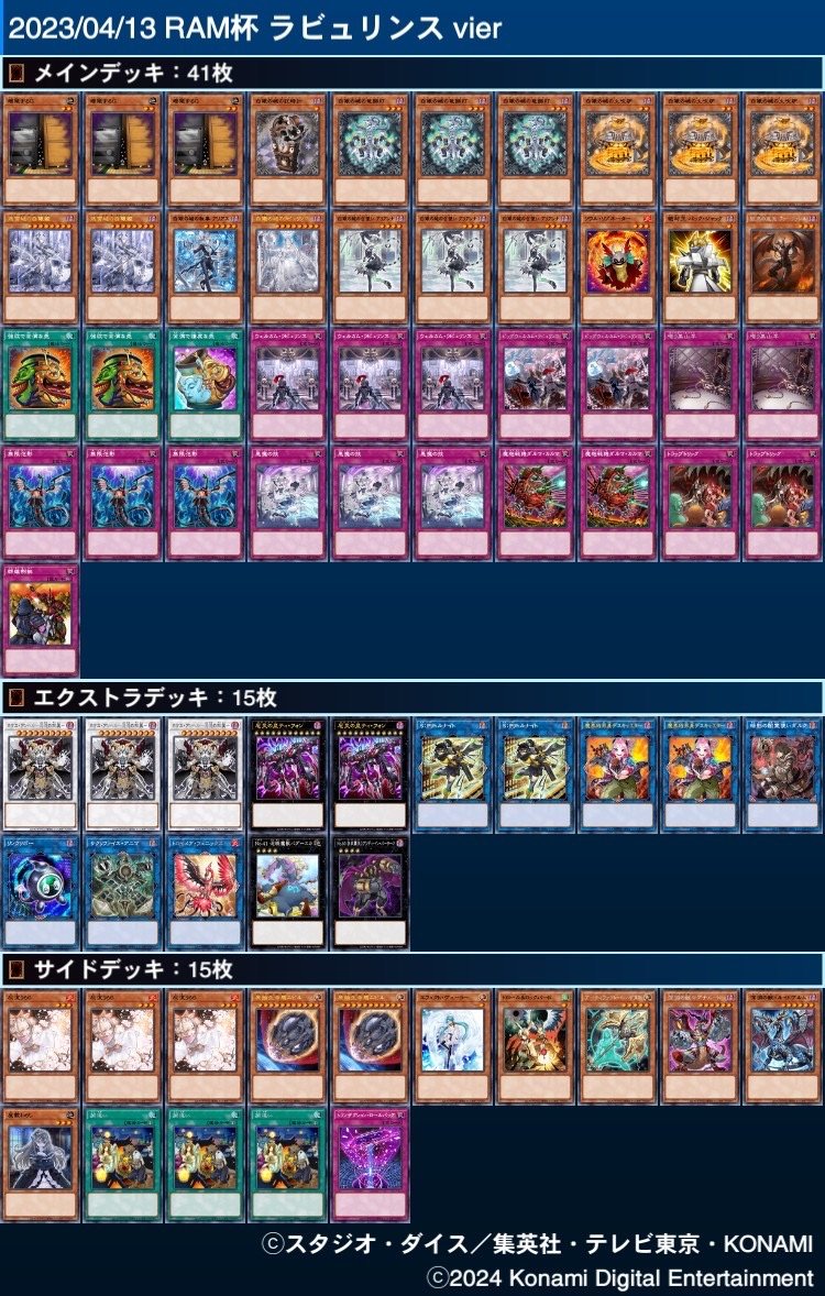 【4/13(土)第37回RAM杯結果①】 参加:78名 ■優勝 vier(ふぃあー)/「ラビュリンス」 □準優勝 スズカ/「天盃龍」 ■ベスト4 ピカイチ/「覇王魔術師」 灼烈のアゴウ/「ピュアリィ」